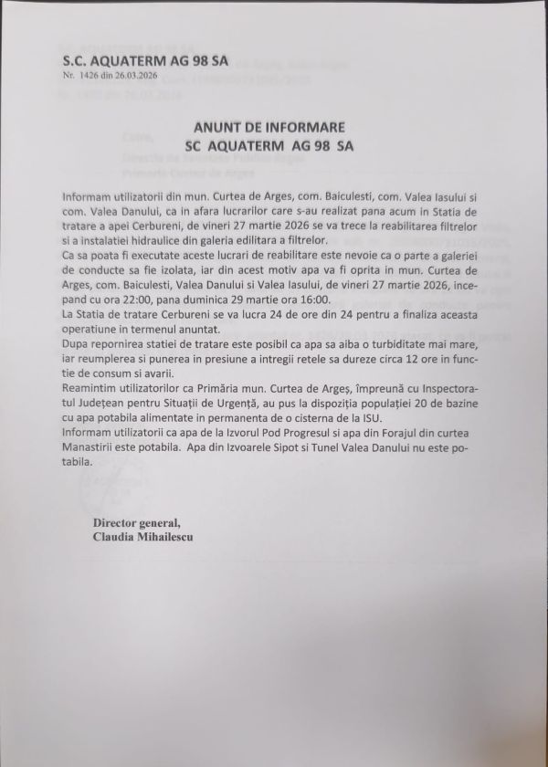 Informam utilizatorii din mun. Curtea de Arges, com. Baiculesti, com. Valea Iasului si com. Valea Danului, ca in data de 10 februarie 2026, incepand cu ora 21:00 apa va fi oprita din Statia de tratare a apei Cerbureni pentru circa 24 de ore in vederea decolmatarii, curatarii, spalarii si dezinfectarii filtrelor si a bazinelor de inmagazinare pentru eliminarea bacteriei clostridium perfringens si reducerea anumitor parametrii fizico-chimici neconformi.