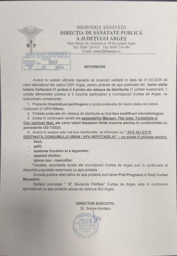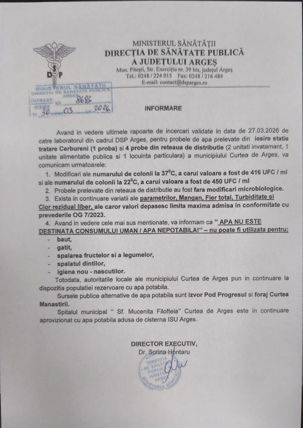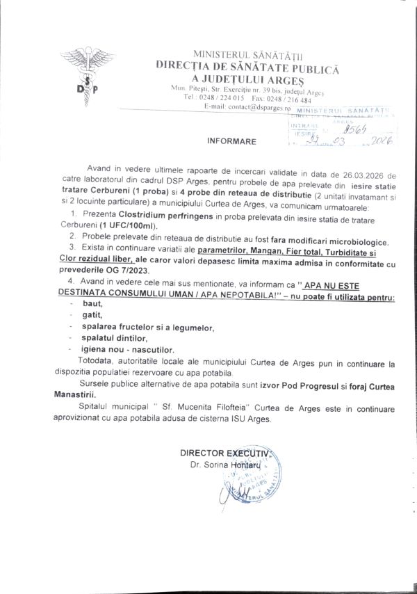 Informam utilizatorii din mun. Curtea de Arges, com. Baiculesti, Valea Iasului si Valea Danului ca in urma analizelor proprii, dar si a celor primite de la DSP Arges in data de 05.12.2025, apa ramane in continuare nepotabila si nu este buna de baut sau gatit.